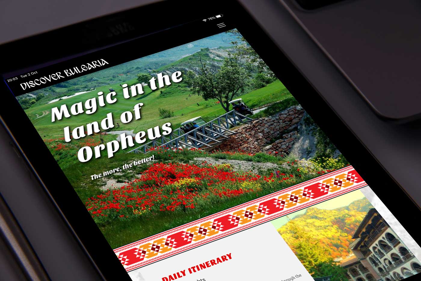 Holiday travel website for Bulgarian folklore, history and Spa. Designed in the visual style of traditional Bulgarian folklore. Just like all our websites, it is fast and optimised for mobile and desktop.
